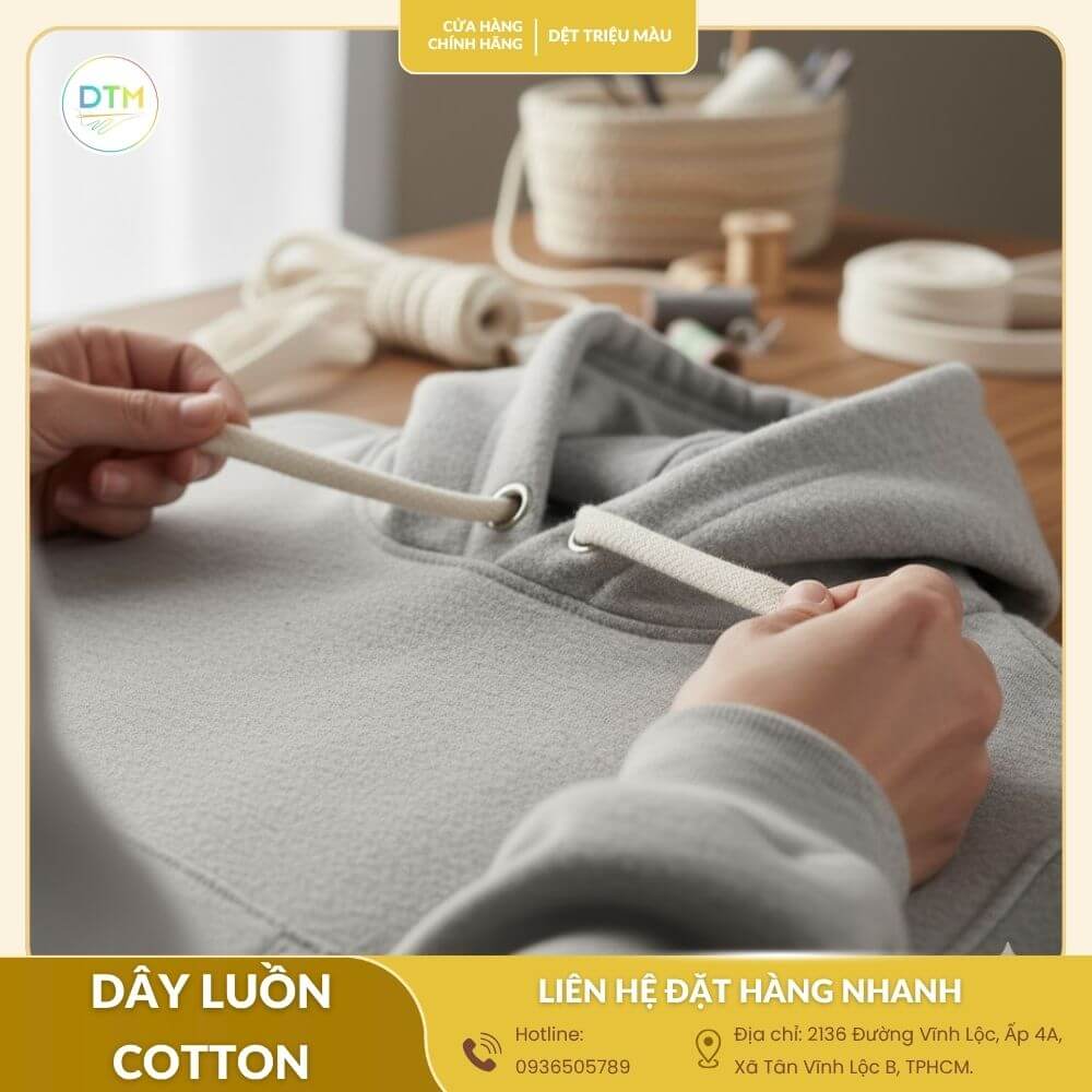 Dây cotton luồn áo là loại dây rút được làm từ sợi cotton tự nhiên, có đặc tính mềm mại, bền chắc và thân thiện với làn da. Trong ngành may mặc, cotton là chất liệu được ưa chuộng nhờ khả năng thấm hút tốt, tạo cảm giác dễ chịu khi sử dụng.