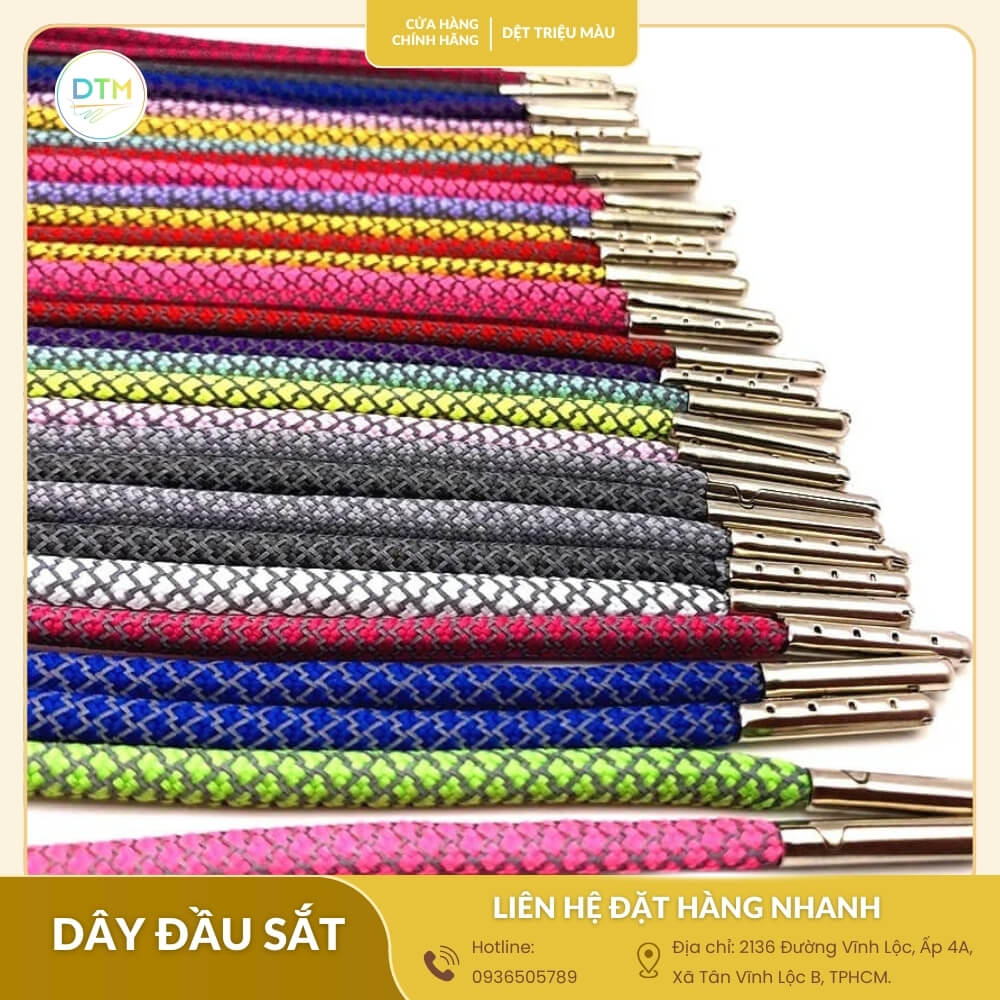- Polyester: Đây là lựa chọn phổ biến cho dây đầu sắt công nghiệp nhờ độ bền vượt trội, chống nhăn, giữ form tốt và giá thành hợp lý. Chất liệu này rất phù hợp cho quần áo thể thao, balo, và các sản phẩm đòi hỏi sự bền bỉ.