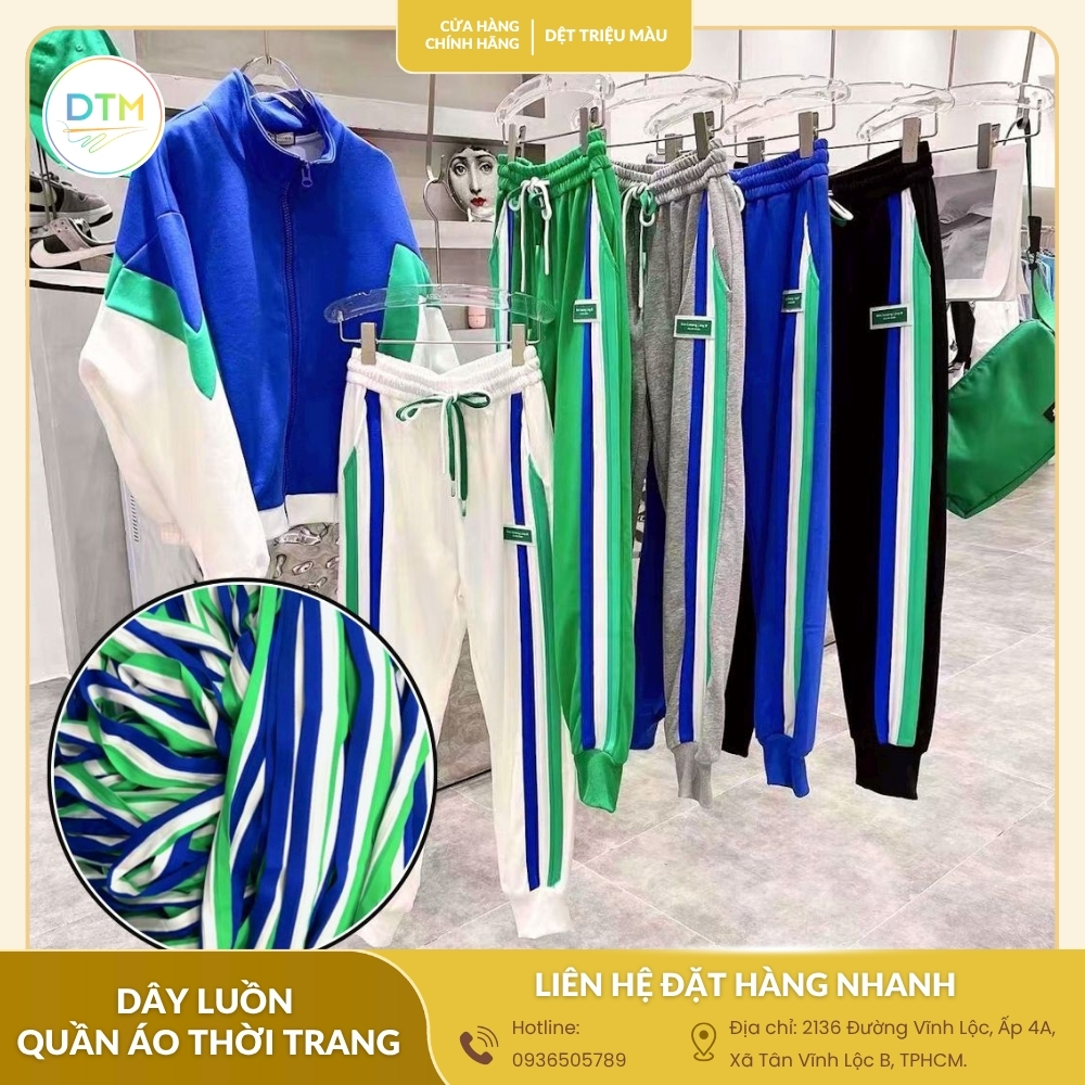 Dây polyester (PE): bền chắc, chống nước, giữ màu tốt ngay cả sau nhiều lần giặt. Bề mặt trơn, hơi bóng, màu sắc đa dạng nhưng thấm hút kém hơn cotton. Thích hợp cho quần thể thao, áo khoác gió, quần jogger năng động.
