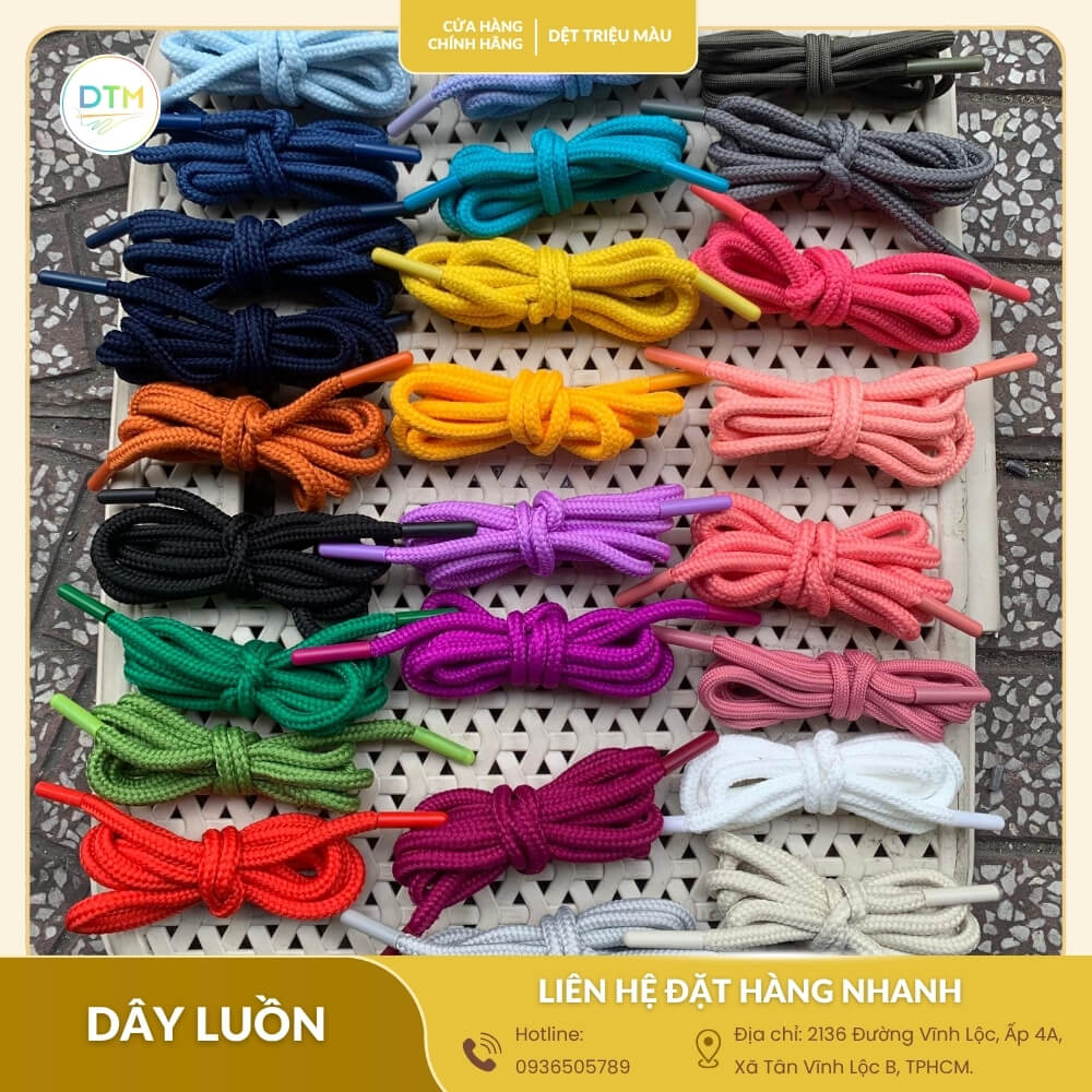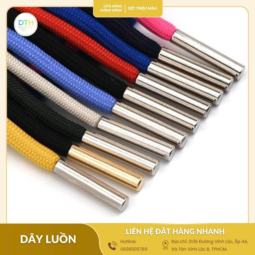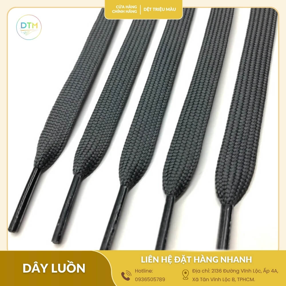 Dây cotton luồn là loại phổ biến nhất với ưu điểm mềm mại, thấm hút tốt, an toàn cho da và phù hợp với quần áo trẻ em hay trang phục thường ngày. Dây polyester luồn có độ bền màu, ít nhăn, thích hợp cho các sản phẩm cần giữ form dáng lâu dài. Dây dù luồn được dệt từ sợi tổng hợp như nylon hoặc polyester, có khả năng chịu lực và chống thấm nước, rất lý tưởng cho balo, túi xách hoặc đồ ngoài trời. Ngoài ra, dây thun luồn có độ co giãn linh hoạt, thường được dùng trong quần jogger, quần short hoặc đồ thể thao. Một số dây đặc biệt sử dụng sợi kim loại hoặc sợi pha, tạo ra sản phẩm chuyên dụng cho bảo hộ lao động hoặc thiết kế cao cấp.