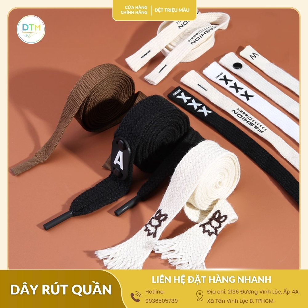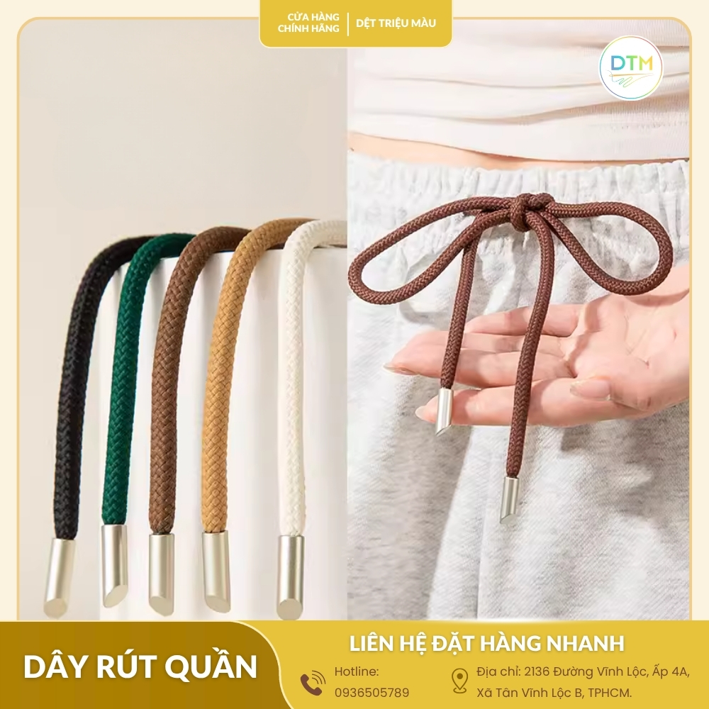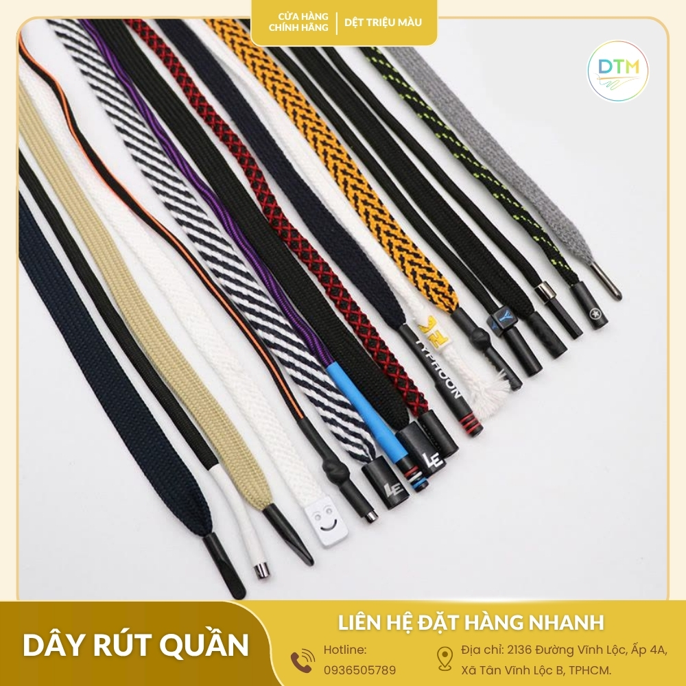 Dệt Triệu Màu là đơn vị chuyên sản xuất và cung cấp sỉ lẻ dây rút quần chất lượng cao, đa dạng màu sắc, chất liệu và kiểu dáng. Chúng tôi cam kết: