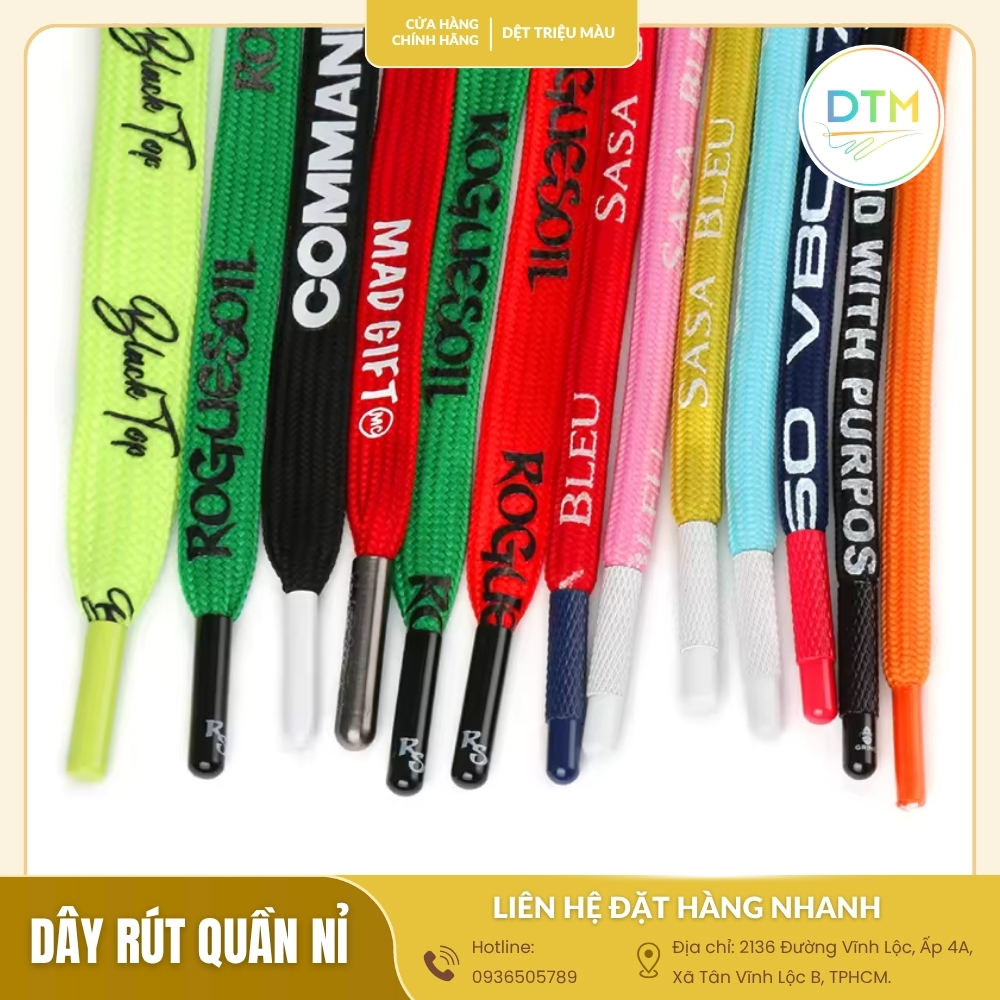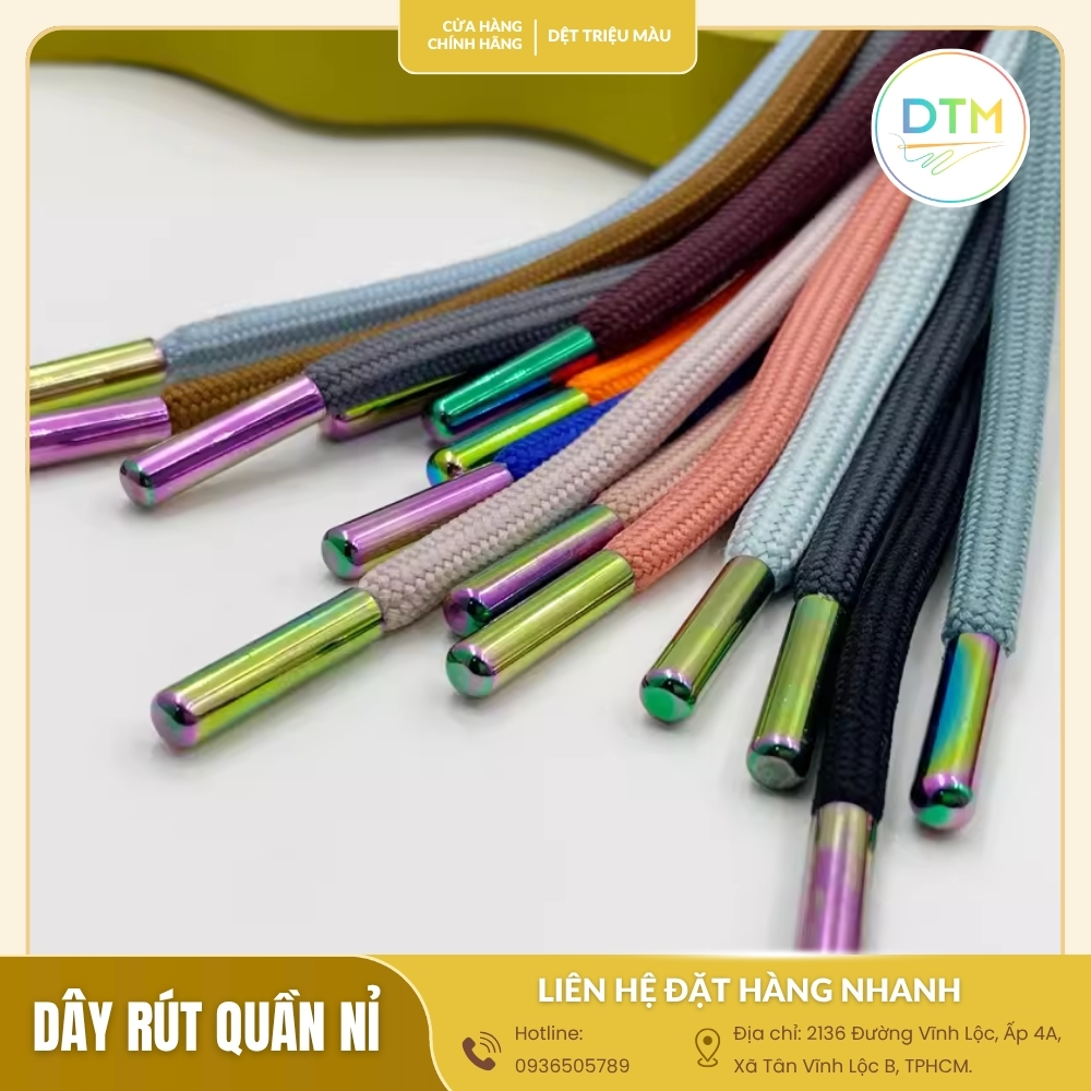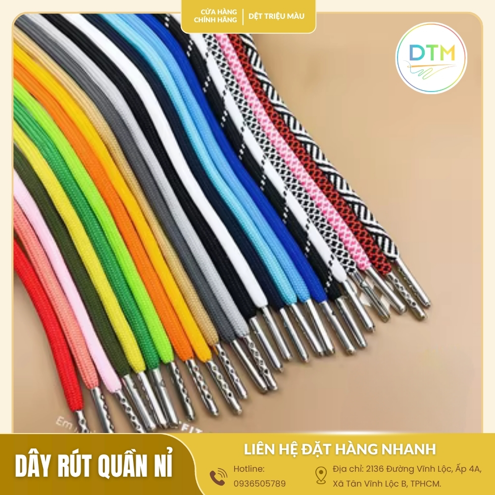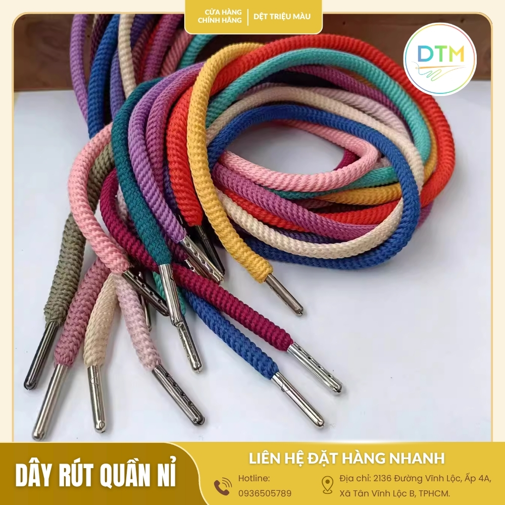 Với số lượng lớn hơn hoặc muốn tìm dây chất lượng ổn định, nhiều khách chọn CÔNG TY TNHH SX & TMDV DỆT TRIỆU MÀU – một địa chỉ uy tín chuyên cung cấp dây rút quần nỉ sỉ và lẻ với số lượng lớn, có đủ màu sắc, chất liệu, thậm chí nhận gia công theo yêu cầu. Đây là lựa chọn tốt nếu bạn cần đồng bộ sản phẩm hoặc đặt riêng mẫu đặc biệt.